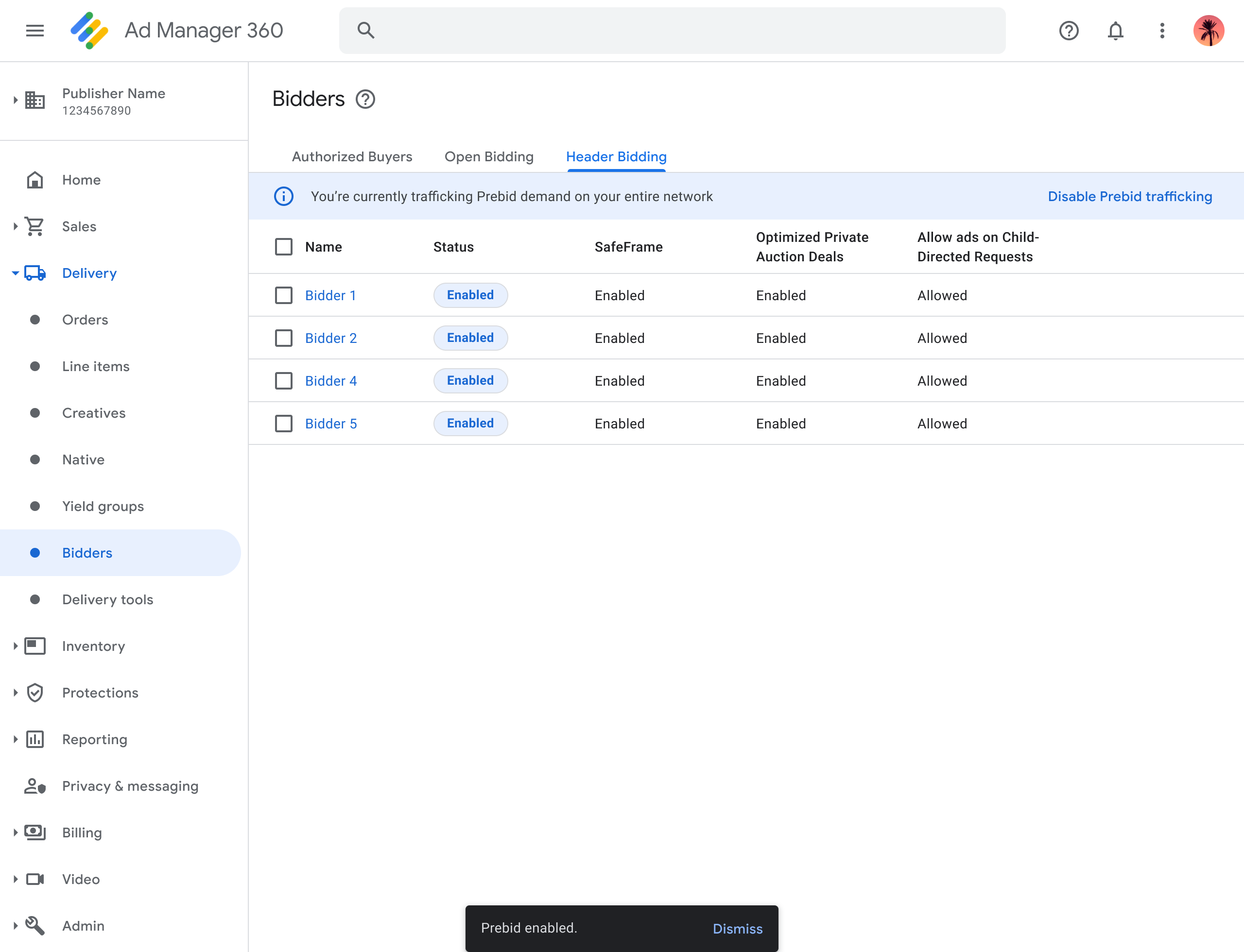 - Click Finish. Your Ad Manager UI should look like this, with your own bidders and specified configuration settings listed.
